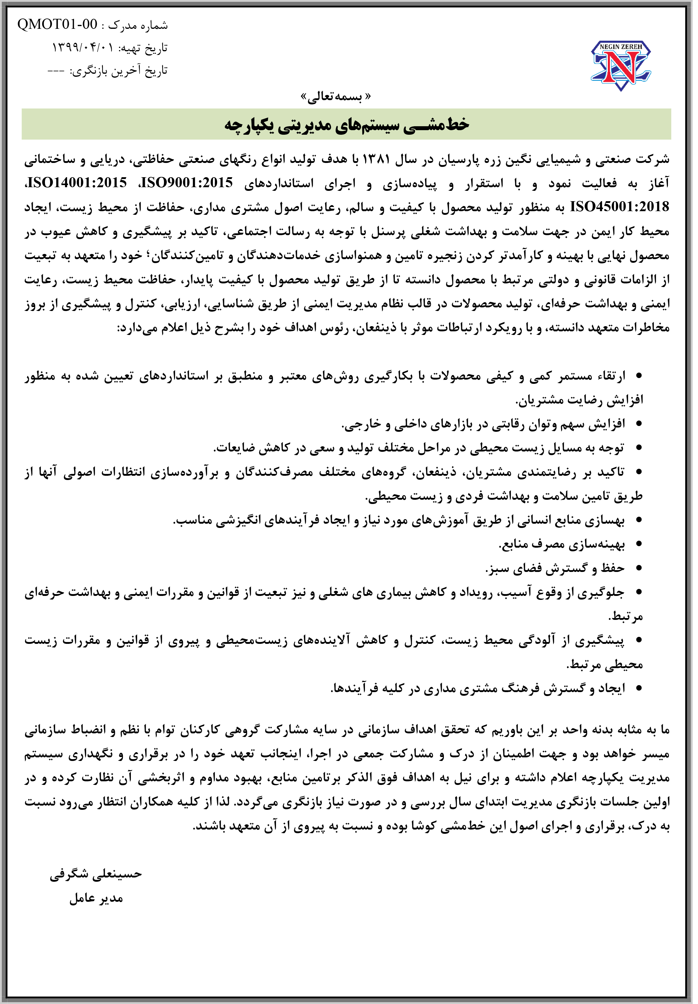 شركت رنگسازی نگين زره از سال 1381 فعاليتهای توليدی خود را در زمينه توليد انواع رنگهای صـنعتی، حفاظتی، دريايی و سـاختمانی آغاز نموده و طی مدت كوتاهی با بهره گيری از پرسنل و كارشناسان كار آزموده و فن آوری روز جهانی، گامهای بلندی در ارتقاء سـطح كيفی محصـولات خود برداشته است. شـركت نگين زره در طـی اين مدت كوتاه مفتخر به دريافت نشان استاندارد گواهينامه مديريت كيفيت ISO 45001:2015, ISO14001:2015, ISO9001:2015 شده است. شرکت نگین زره با بهره گيری از آخرين دست آوردهای تكنولوژيكی، علمی و آزمايشـگاه مجهز در عرصـه صـنايع شـيميايی، پتروشيمی، پالايشگاهی، صنايع دریايی و ساختمانی مطـرح شده و با استفاده از آخرين فن آوری در زمينه فرمولاسيونهای جديد و توليد انبوه، در رديف بزرگترين توليد كنندگان اين بخش از صنعت كشور قرار گرفت. شركت نگين زره با توانمندی بالا در زمينه دانش فنی به روز و تحقيقات و خدمات آزمايشگاهی قادر به طـراحی و ساخت توليد انواع رنگها بوده و آماده ارائه خدمات مشاوره ای، آموزشی و خدمات مهندسی قبل و بعد از فروش می باشد. امید است بتوانیم در جهت اعتلای کشور عزیزمان ایران گامی برداریم.